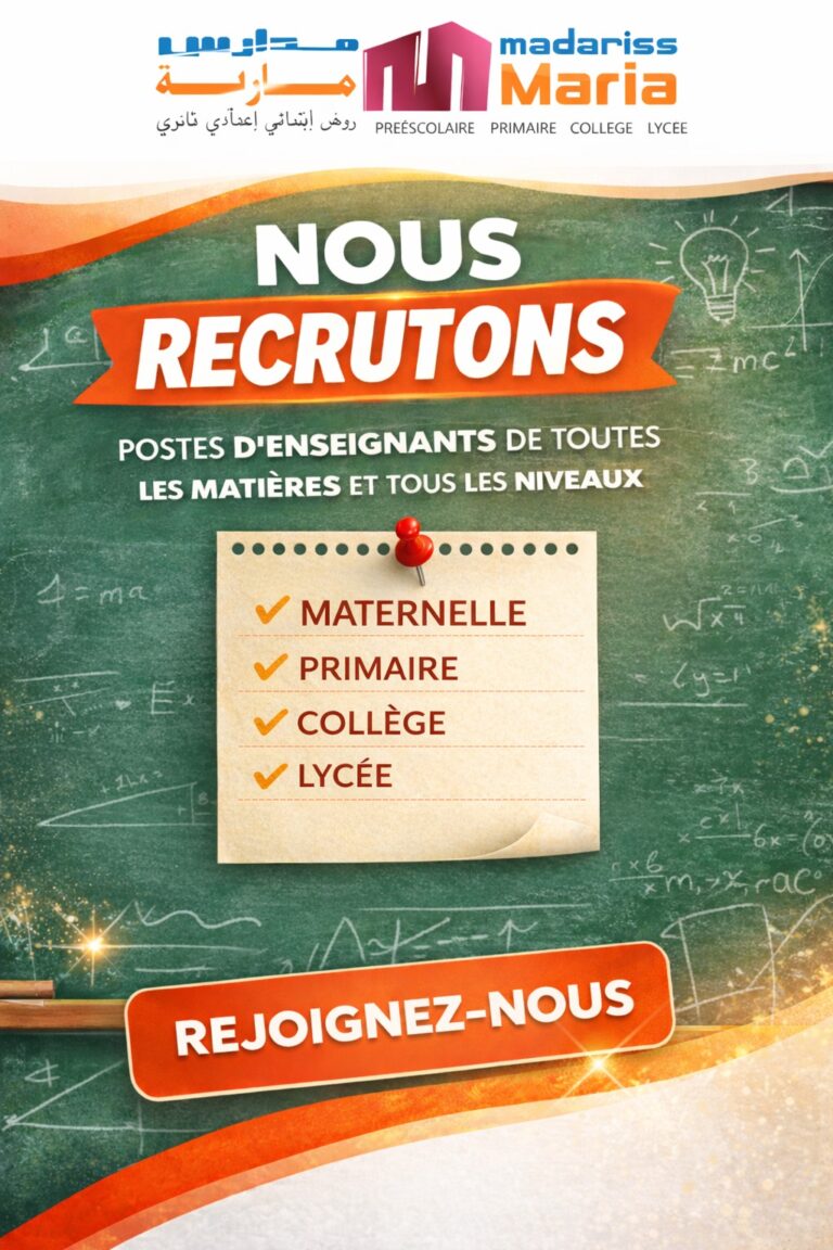 Vous souhaitez nous rejoindre ? MADARISS MARIA ouvre la porte des candidatures pour des postes d’enseignants de toutes les matières et tous les niveaux (Maternelle, Primaire, Collège et Lycée). Postuler